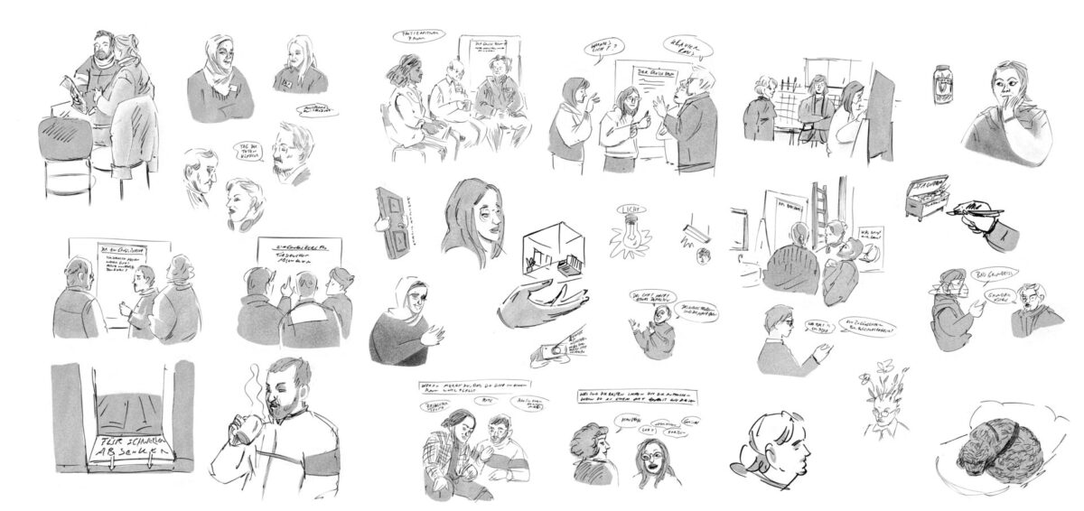 Im Hintergrund hat Maik Hasenbank unseren Workshop als Graphic Recording in Echtzeit aufgezeichnet. Seine Zeichnungen werden als schöne Erinnerung und visuelles Protokoll unseres gemeinsamen Brainstormings dienen.