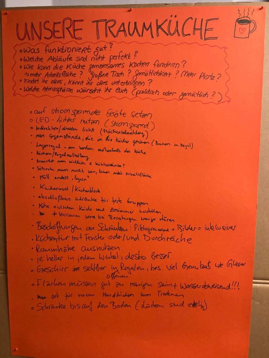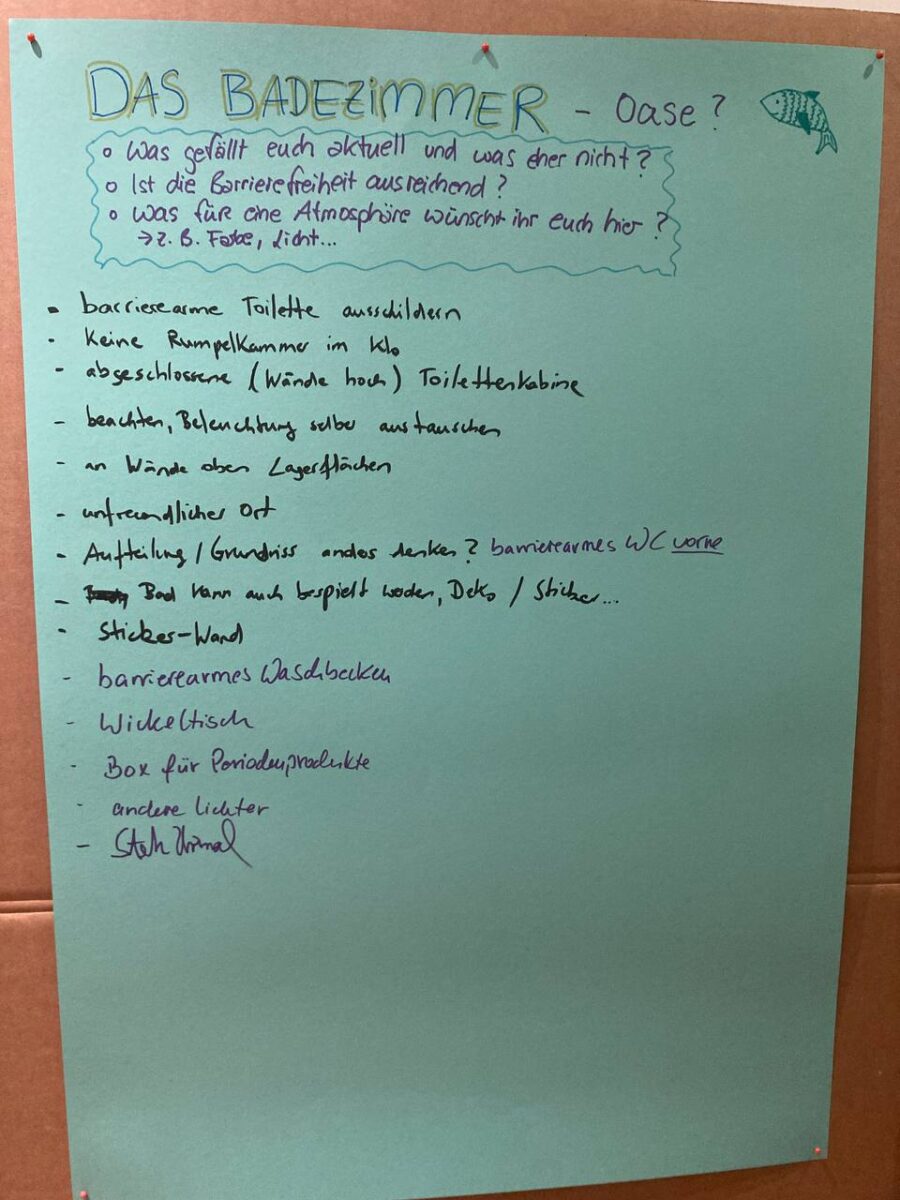 Es gab viele Ideen, rege Unterhaltung und einige Zukunftsmalerei: das Lichtkonzept sollte anpassbar sein an verschiedene Bedarfe, es kann noch viel für die Barrierefreiheit getan werden, z.B. mehr Schallschutz oder auch mehr Platz für Rollstuhlfahrer*innen oder Kinderwagen, der Stauraum könnte intelligenter genutzt werden, die Küche braucht dringend ein Update mit mehr Arbeitsfläche und das WC könnte auch ein freundlicherer Ort werden.
